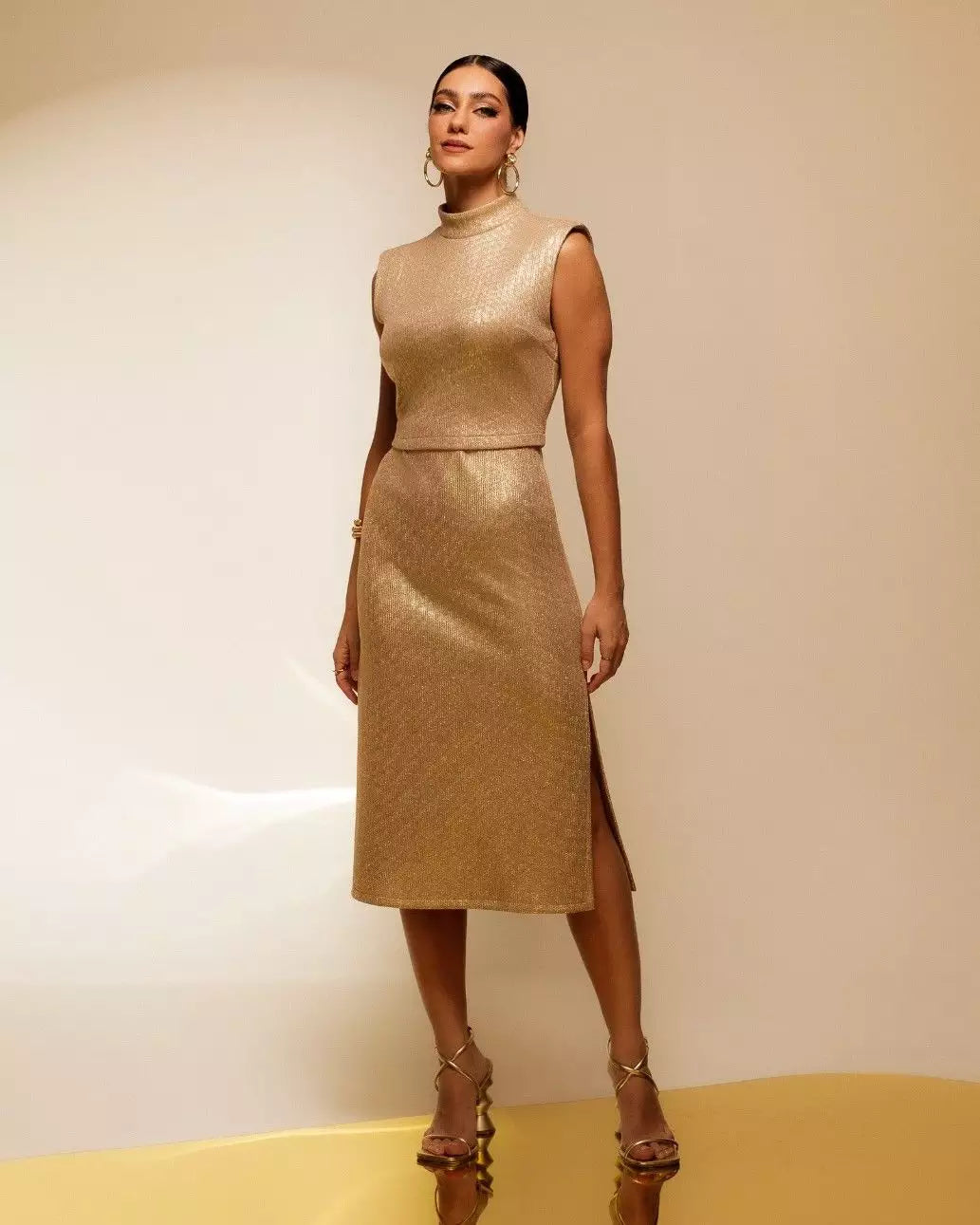 Conforto Elevado: A cintura elástica não só assegura um ajuste perfeito mas também oferece conforto máximo. Quer esteja dançando sob as estrelas ou a caminho de um encontro elegante, a Saia Midi Malha Lurex Dourada promete um conforto inigualável.